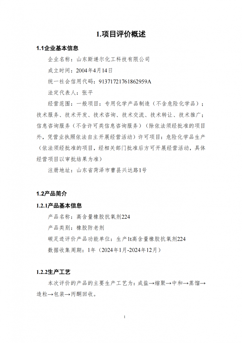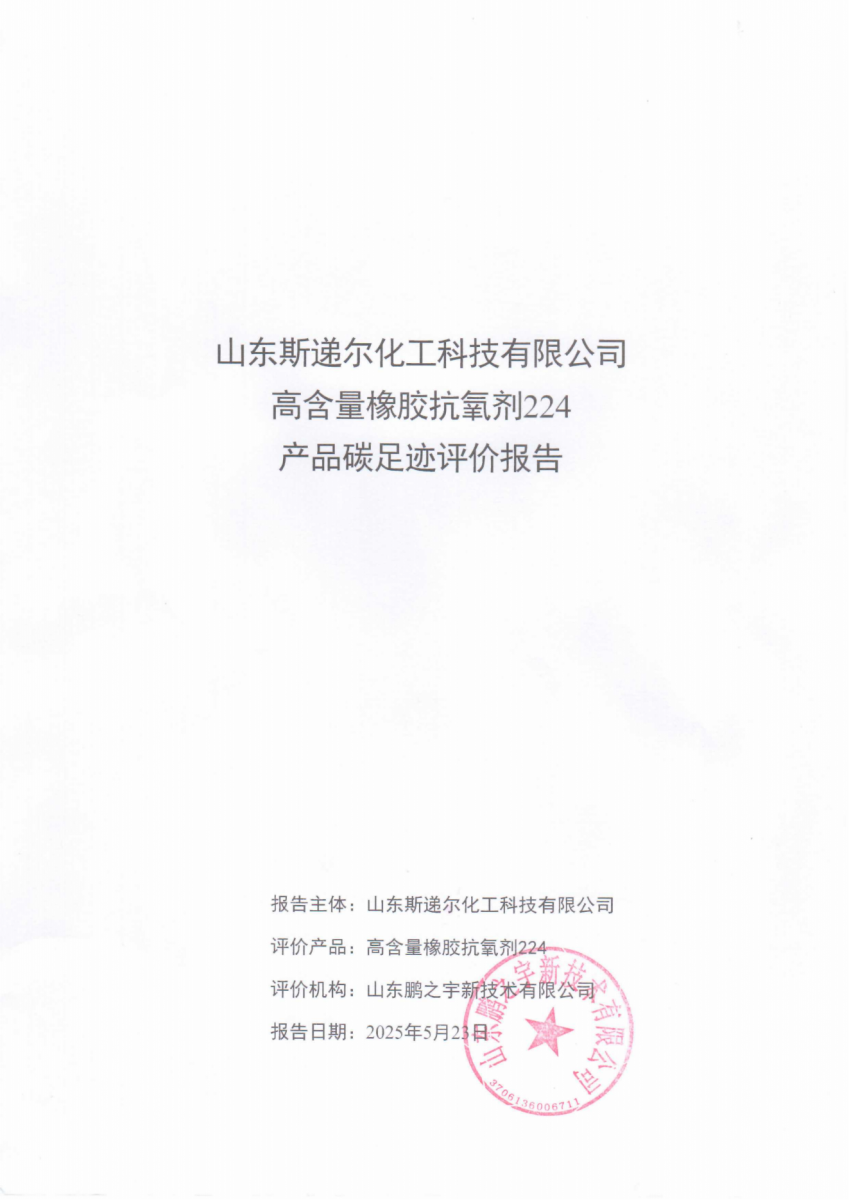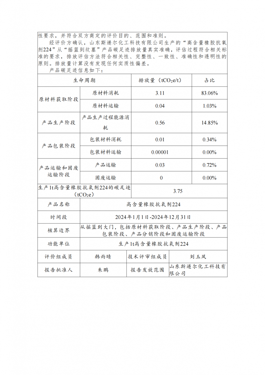 山東斯遞爾化工科技有限公司高含量橡膠抗氧劑224產品碳足跡評價報告